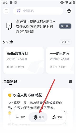 2、在【Get筆記】首頁,找到底部的【錄音】按鈕并點(diǎn)擊,可進(jìn)入錄音功能的模式選擇界面。
