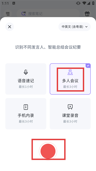 3、在錄音功能選擇界面,選定【多人會議】模式后,點(diǎn)擊底部紅色按鈕,即可啟動該模式下的錄音操作。