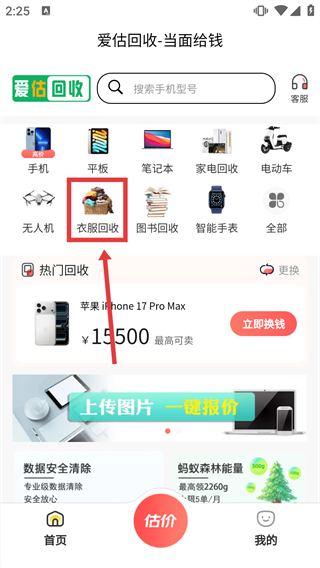 1、在愛估回收首頁,找到【衣服回收】選項(xiàng)并點(diǎn)擊,進(jìn)入衣服回收的專屬操作頁面,可查看回收種類、回收流程等信息。