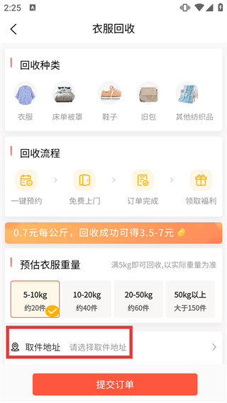 2、在衣服回收頁面,選定回收品類與預(yù)估衣服重量(需滿5kg),隨后點(diǎn)擊【取件地址】選項(xiàng),進(jìn)入地址管理頁面。