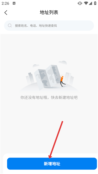 3、在地址列表頁面,因當(dāng)前無保存地址,點(diǎn)擊底部的【新增地址】按鈕,進(jìn)入地址添加流程。